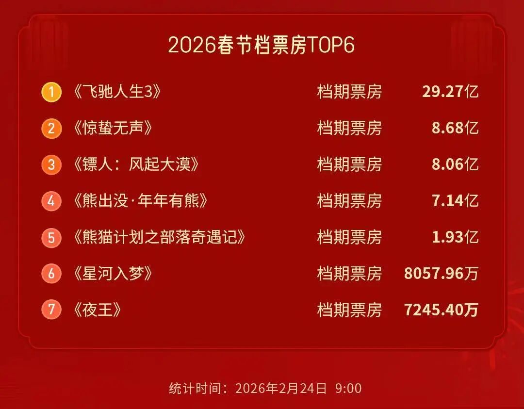 2月24日,貓眼研究院《2026春節(jié)檔數(shù)據(jù)洞察》顯示,截至2月24日9時,今年春節(jié)檔電影總票房達到57.52億元,總觀影人次1.2億。