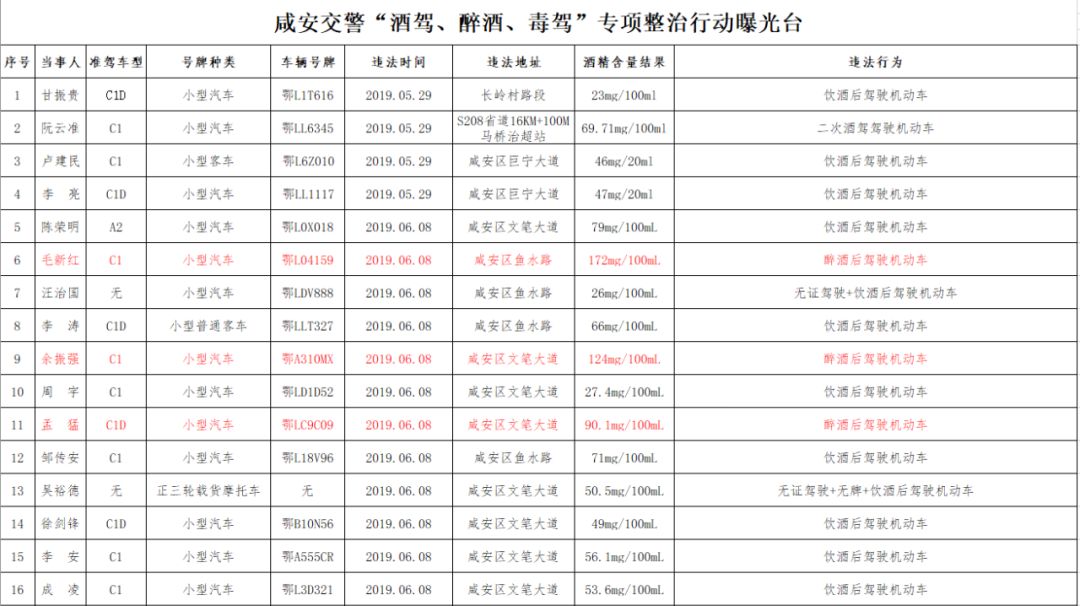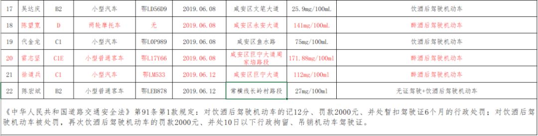 咸安公安分局交警大隊(duì)對(duì)酒駕醉駕持續(xù)保持高壓嚴(yán)管“零容忍”態(tài)勢(shì),同時(shí)對(duì)近半個(gè)月(5月29日——6月13日)以來(lái)的酒駕醉駕駕駛?cè)诉M(jìn)行實(shí)名曝光。