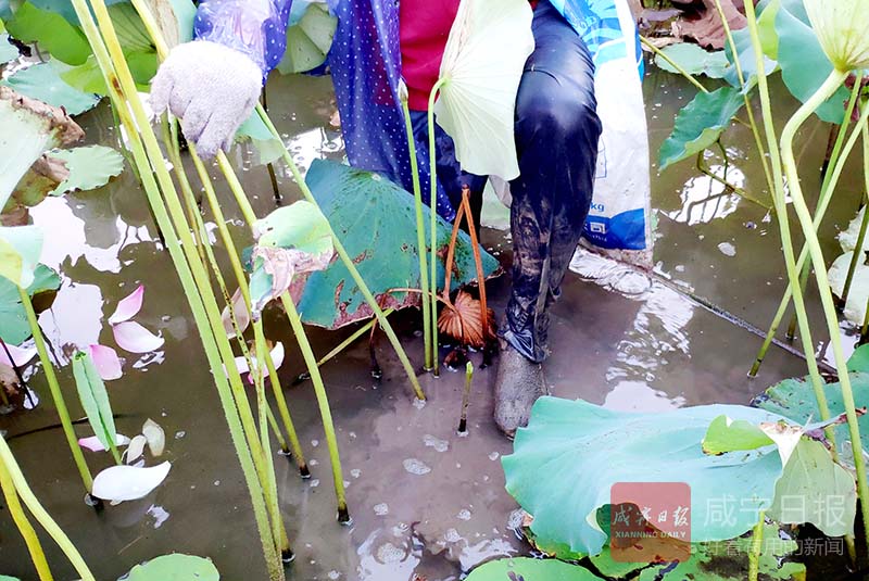 荷田里荷葉密集,既悶又熱,有些地方淤泥齊膝。蓮農(nóng)們一般身前身后各掛一個編織袋,大約 40分鐘采滿上岸。