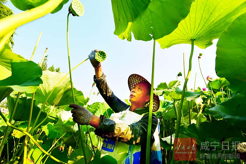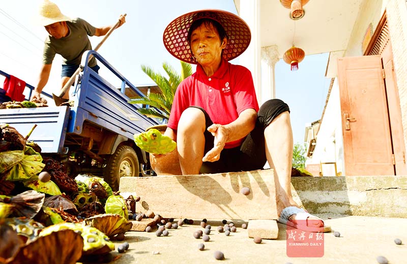 “現(xiàn)在每天5點半就下田,天太熱,一般采到9點多收工,怕中暑?!眲⑺既河靡滦洳亮艘话押顾榻B,夏天是蓮子的高產(chǎn)季,村里大概有60多戶種湘蓮,每天100多人在田里勞作。
