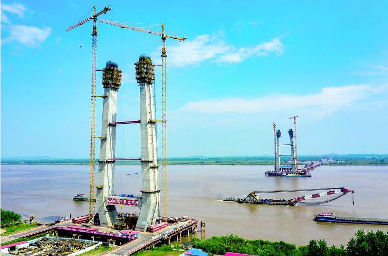 8月21日,赤壁長(zhǎng)江大橋正在進(jìn)行南北主塔中塔柱施工,南北主塔高度達(dá)到了133米,占總高度的60%左右。赤壁長(zhǎng)江大橋連接赤壁市與洪湖市,主橋是雙塔雙索面斜拉結(jié)構(gòu),主塔為H形。承建單位中鐵大橋局在高溫天氣縮短白天施工時(shí)間,早晚補(bǔ)工,保障施工進(jìn)度不因酷暑延后。預(yù)計(jì)明年2月能按期實(shí)現(xiàn)主塔封頂?shù)仁┕つ繕?biāo)。(視界網(wǎng) 馬海斌 攝)