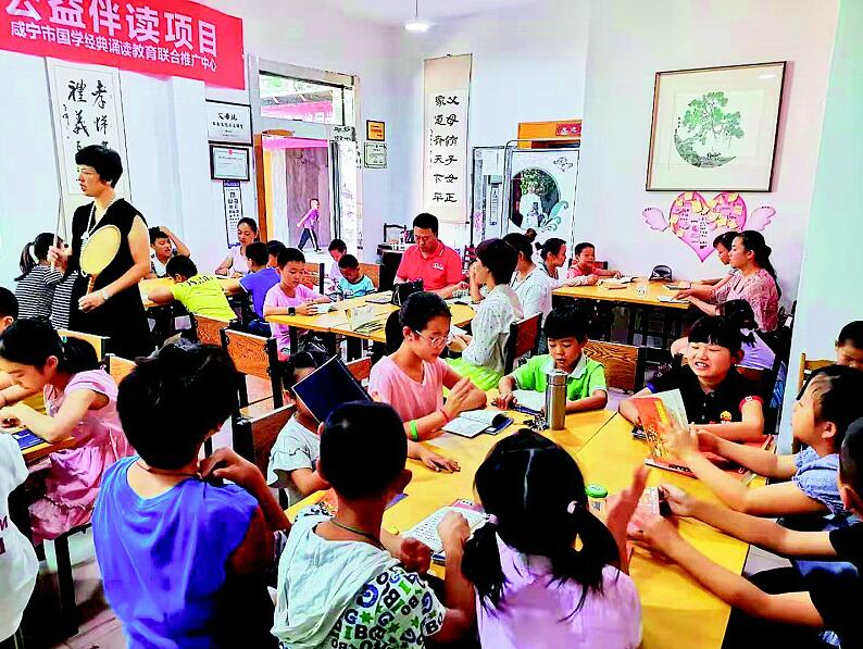 圖為:咸寧市咸安區(qū)溫泉街道南昌路社區(qū)國學推廣中心火熱的學習場景。