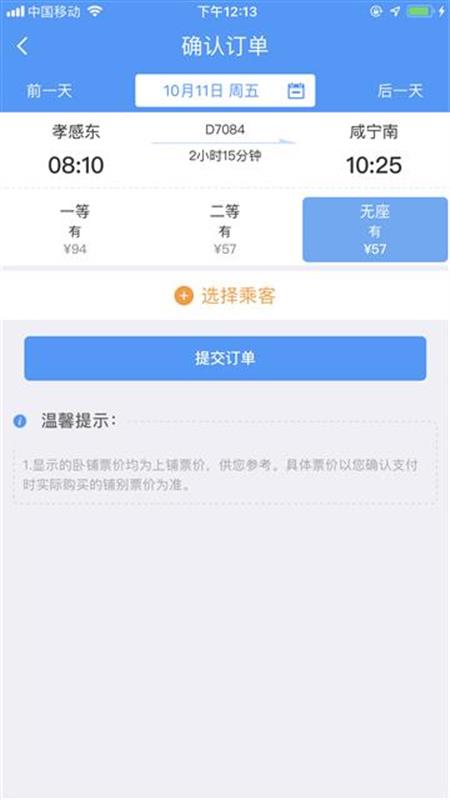 票價(jià)方面:一等座94元,二等座57元,無(wú)座57元。