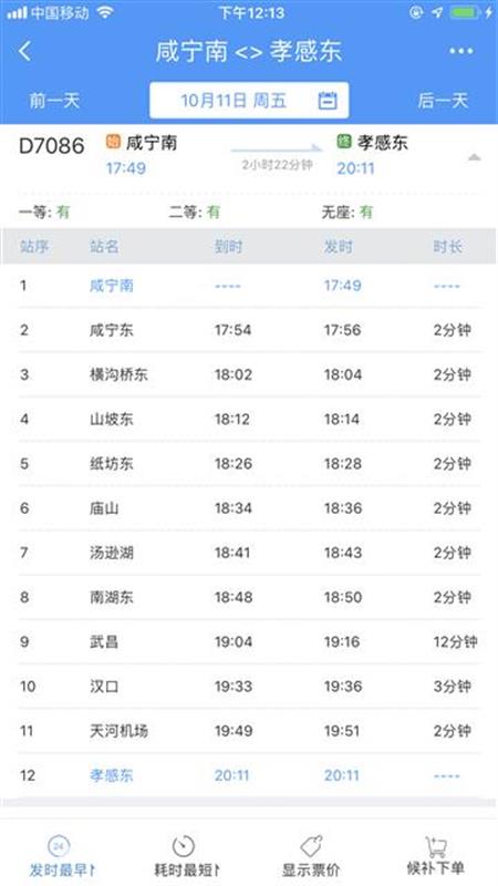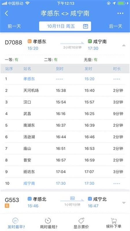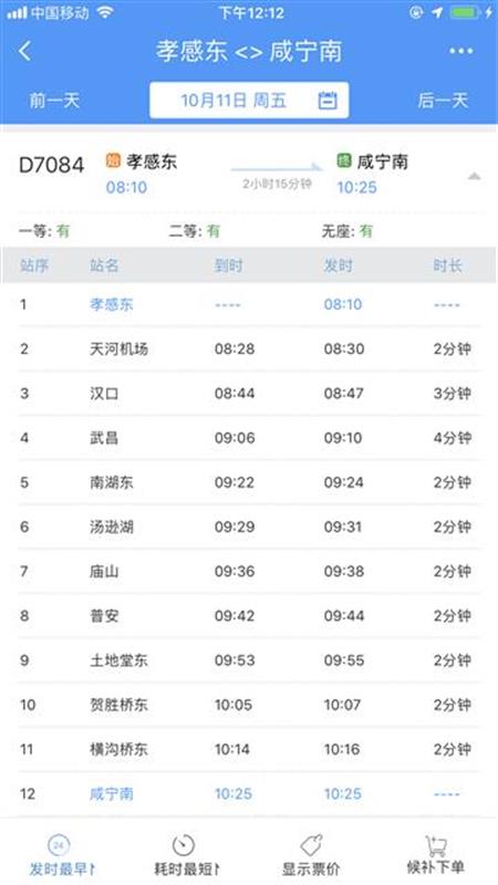 10時(shí)40分從咸寧南始發(fā),沿途停靠咸寧東、橫溝橋東、賀勝橋東、土地堂東、紙坊東、普安、廟山、湯遜湖、南湖東、武昌、漢口、天河機(jī)場(chǎng)等站,13時(shí)04分終到孝感東站;