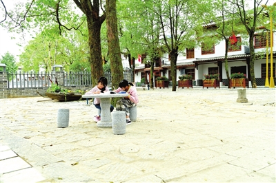 寧靜的羊樓洞廣場上,安靜地做功課的孩子?!⊥ㄓ崋T 黃富清 攝