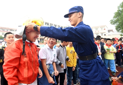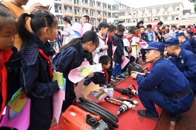 陰雨天氣,絲毫沒有影響師生們的學習熱情。大家對防災減災知識和自救互救技能不停地向消防官兵和志愿者問詢?!拔覍W會了滅火器的使用方法,先拆開包裝,迅速把滅火器搖一搖,然后按下滅火開關?!比?)班小朋友沈昭對記者說。