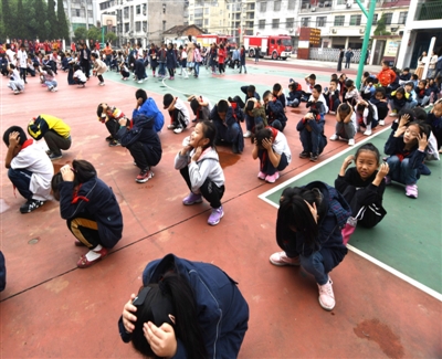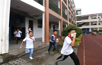 師生們一手捂著口鼻,一手扶著墻壁半蹲行進,緊張、有序、快速地撤離教室,短短的1分56秒,全校師生全部撤離到應急避難場所——學校操場。接著,各班班主任迅速清點人數(shù),向校主任報告完畢,演練結(jié)束。