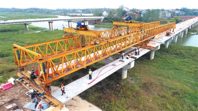 10月15日,咸安區(qū)淦河流域官埠窯咀大橋工地上,工人們正在吊裝最后一片箱梁,這也標(biāo)志著該座大橋正式合龍。