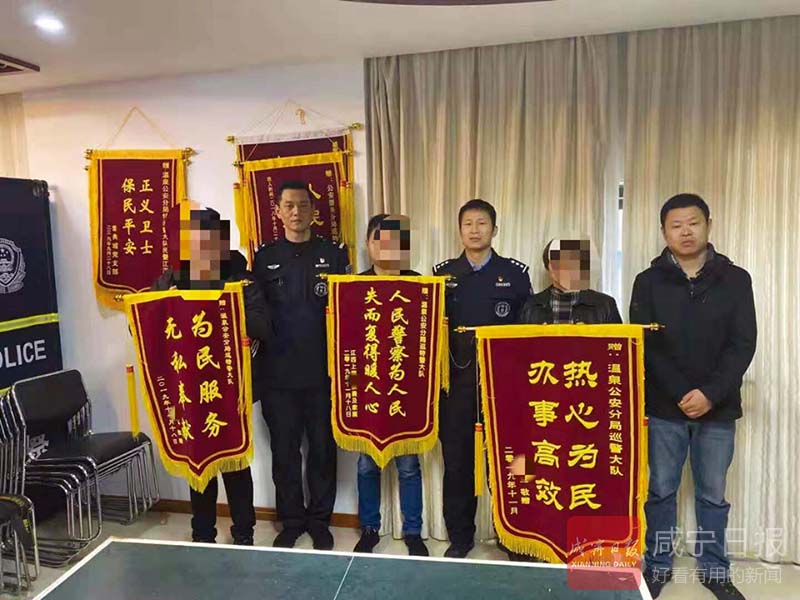 咸寧網訊(香城都市報記者 方達星 通訊員 胡微) 11月18日上午,山東騰州的楊先生、浙江上虞的倪女士以及江西上饒的張先生三人,將三面錦旗送到溫泉巡特警手中。他們連連道謝,感激之情溢于言表。