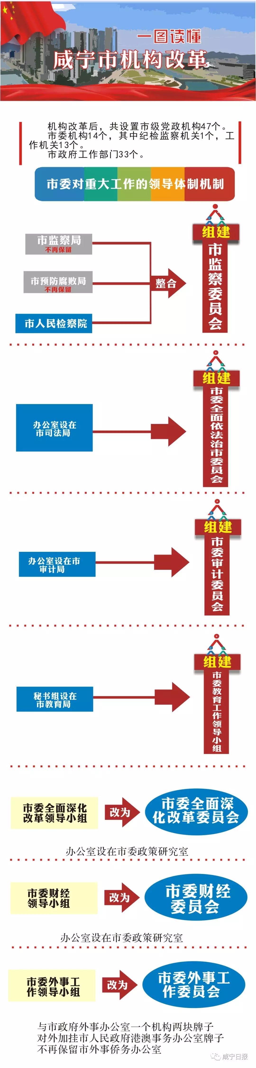 我市召開機(jī)構(gòu)改革動(dòng)員大會(huì),標(biāo)志著我市機(jī)構(gòu)改革全面啟動(dòng)。根據(jù)省委省政府批準(zhǔn)的《咸寧市機(jī)構(gòu)改革方案》,本輪機(jī)構(gòu)改革后,市本級(jí)共設(shè)置黨政機(jī)構(gòu)47個(gè)。市委機(jī)構(gòu)14個(gè),市政府工作部門33個(gè)。改革方案還對(duì)黨政直屬事業(yè)單位實(shí)施了限額管理,并進(jìn)一步規(guī)范了黨政派出機(jī)構(gòu)置。
