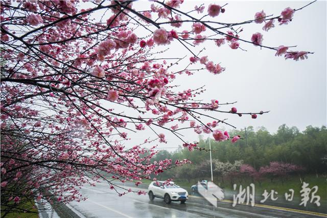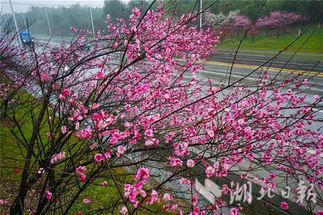 2月13日,咸寧市咸安區(qū)桂鄉(xiāng)大道兩旁的紅梅花在風雨中含笑迎賓。眼下,隆冬尚未消退,風雨交夾,寒氣逼人。位于湖北省南部的咸寧市,紅梅花在枝頭綻放,預(yù)示著春天的腳步越來越近了。(湖北日報全媒記者 陳勇 攝)