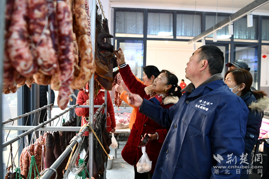 在肉類攤位前,剁了20多年肉砧板的胡金山割肉的手麻利多了——他邊賣肉,邊招呼顧客,今天喜遷新市場,瞧這秤也足足的。排著長隊(duì)購買“兩頭烏”豬肉的顧客不時(shí)盯著屏幕上中央電視臺(tái)拍攝采訪這位養(yǎng)豬大戶的專題片,有的掃一掃二維碼,看養(yǎng)豬場實(shí)況。