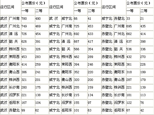 武廣客專高速動車組列車票價(jià)表