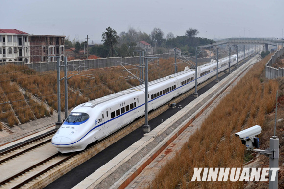 12月26日9時(shí)16分許,從武漢始發(fā)的首列動(dòng)車組列車行駛在湖北省咸寧市境內(nèi)的武廣鐵路客運(yùn)專線上。 當(dāng)日,武廣高鐵正式通車運(yùn)營(yíng),標(biāo)志著我國(guó)步入高速鐵路新時(shí)代。 新華社記者 杜華舉 攝