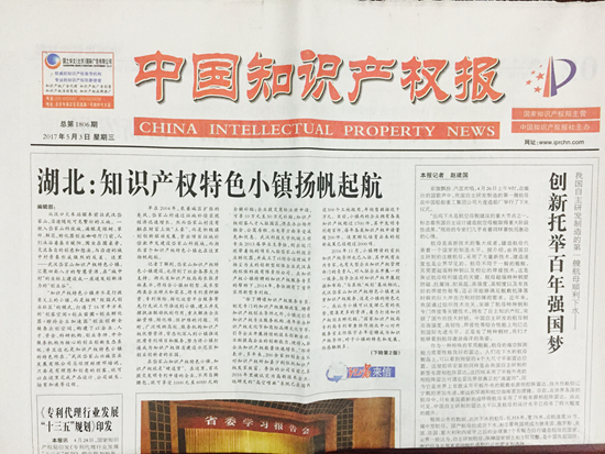 5月3日,中國(guó)知識(shí)產(chǎn)權(quán)報(bào)頭版頭條刊登了《湖北:知識(shí)產(chǎn)權(quán)特色小鎮(zhèn)揚(yáng)帆起航》的新聞,向百萬(wàn)公眾報(bào)道了武漢岱家山知識(shí)產(chǎn)權(quán)特色小鎮(zhèn)。