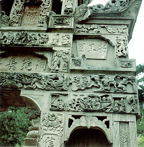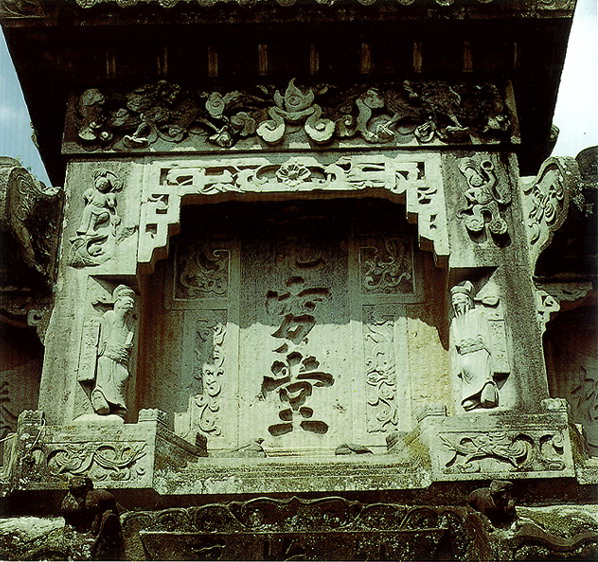 石雕 湖北省北有秦嶺東沿的武當(dāng)山、大別山、桐柏山,西接云貴高原,東南為幕阜山脈環(huán)繞,中部是寬闊的江漢平原。山區(qū)產(chǎn)石料,為石雕提供了豐富的用材;平原燒泥土制磚瓦,鐫以圖案美化建筑。民間石雕、磚雕分布,與地形大體一致。?凳耦}材廣泛,大致分為日常生活、倫理教化、神話傳說(shuō)、戲文故事、花鳥蟲魚、書文楹聯(lián)六類。